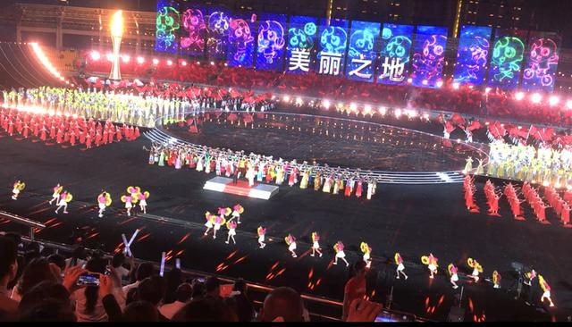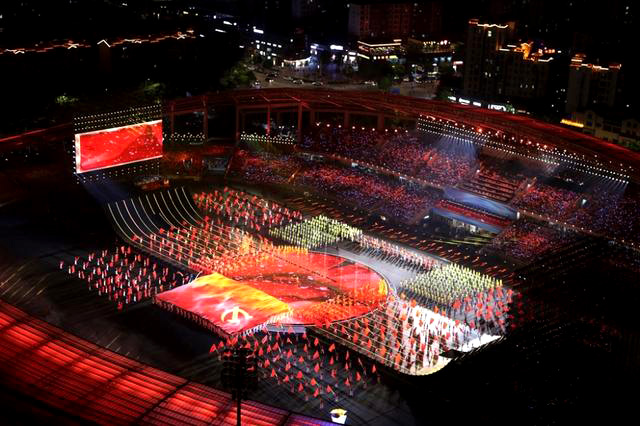舞臺中央特制的直徑45米圓形地磚屏,全程大放異彩。1632平方米地屏畫面伴隨著節目的變化,時而是明月高山,寧靜高遠;時而變成紅色經典,慷慨激揚。地屏、透明屏、空中網幕交相輝映,結合聲、光、電、數字影像等高科技元素,增強文體展演的科技感,并通過在現場使用VR虛擬現實、全息投影等技術,讓觀眾仿佛身臨其境,在驚嘆LED魅力的同時對六運會的精彩紛呈充滿期待。