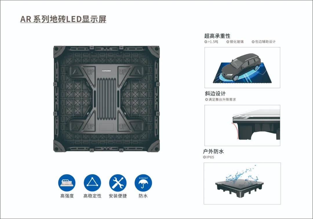 舞臺地面鋪設光祥 AR 4.81 系列地磚屏。光祥 AR 4.81 系列超強耐磨的黑色鋼化玻璃面罩,堅如磐石,抗壓抗磨損,讓每顆像素的顯示仿佛在空中跳躍,在充滿想象力與表現力的舞臺上,光影爛漫,虛實相合,藝術的美感與科技的硬核融為一體,聲、景、人共同傳遞出新中國勇攀高峰的力量,新時代的新氣象鋪陳開來。