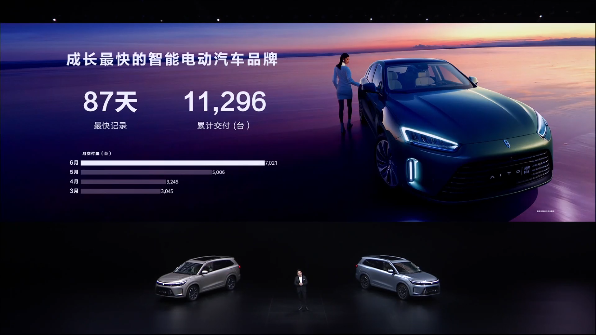 華為與賽力斯聯(lián)合打造的新車問界M7也是本次發(fā)布會的重點新品。問界M5作為高端汽車品牌AITO旗下首款車型,曾創(chuàng)下五月單月交付量破5000臺的紀錄,而M7系列定位豪華智慧大型電動SUV,將滿足更高需求,繼續(xù)引領汽車智能化、電動化趨勢。