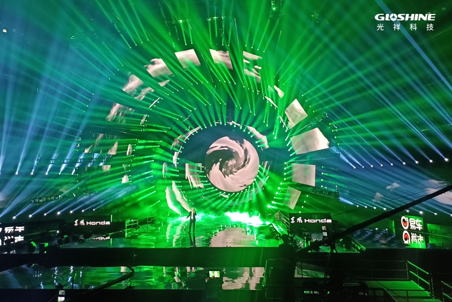 在超級818汽車狂歡夜上,光祥VA系列透明顯示屏圍繞主屏呈螺形排開,如花朵般綻放,花瓣從緊密到疏朗旋轉著伸展,惟妙惟肖。極致輕薄的VA顯示屏,具備高通透率,高穩定性,色彩還原更逼真,舞臺造型豐富多變,是大型晚會舞臺造型、體育賽事、媒體廣告的常用LED顯示屏。