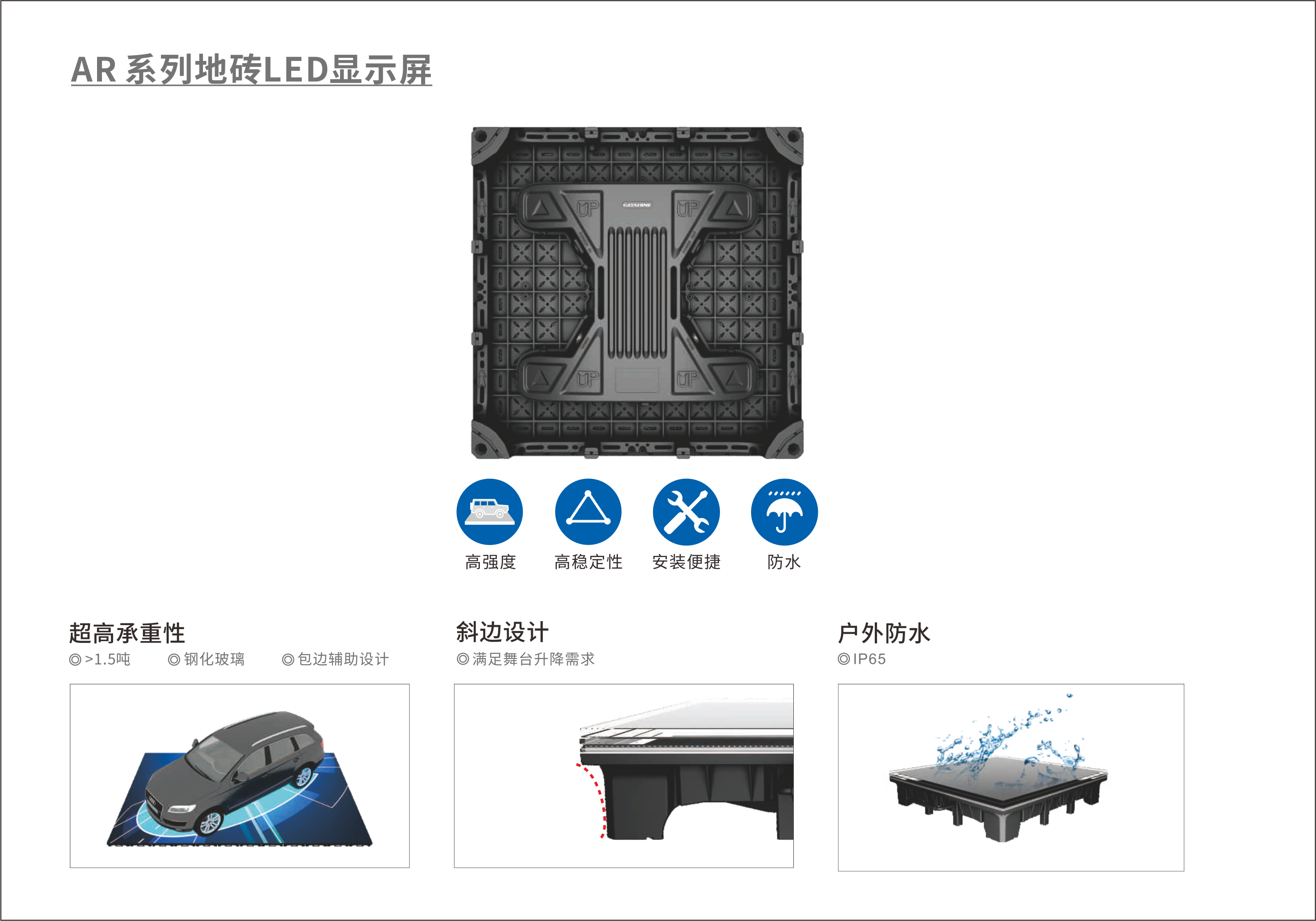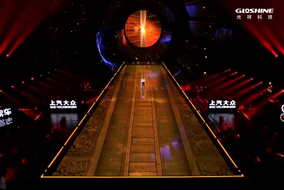舞臺地面是光祥AR系列地磚LED顯示屏,鋼化玻璃屏面罩,有著超強的承重力,無懼汽車行駛。其斜邊設計滿足舞臺升降需求,防水防刮,安裝便捷高效。