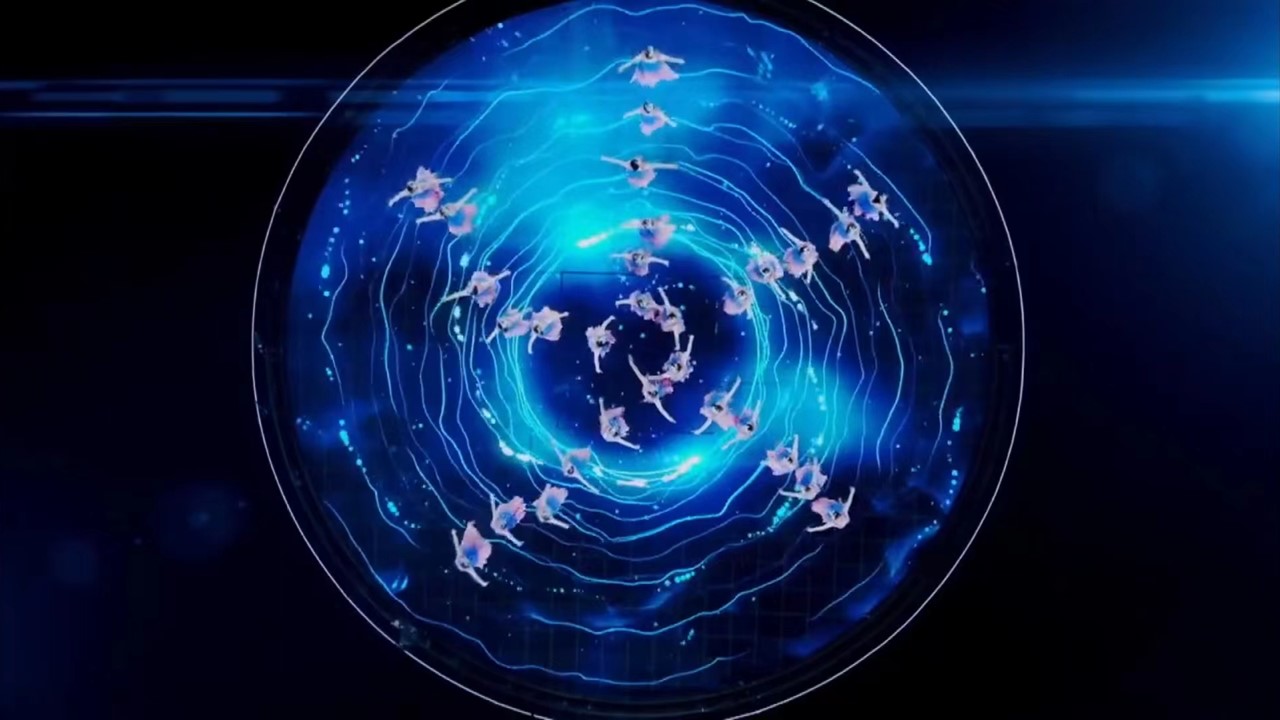 鏡頭隨時光流轉,升至上空落在舞臺中央正上方,演員的身姿,伴隨著音樂和地上的光影起舞、旋轉。似在銀河里,沉醉地飛翔,漫游星空。