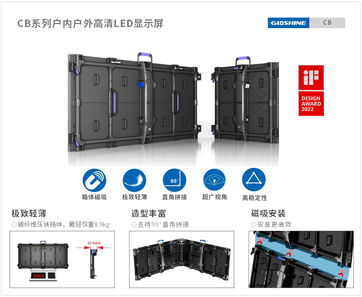 CB系列超輕量化的模組及超高強(qiáng)度的箱體結(jié)構(gòu),使得顯示屏的安裝、拆卸、維護(hù)更加輕便。而箱體的磁吸裝置更是極大地提高了安裝效率。