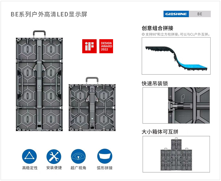 光祥BE系列戶外高清LED顯示屏,設(shè)計(jì)時(shí)尚簡(jiǎn)約,單箱體雙快速吊裝鎖、單側(cè)雙拉緊結(jié)構(gòu),高效組裝,拼接更緊密平整。支持90°直角拼接與立方柱拼接,支持與CL系列戶外屏互相拼接,造型靈活多變。
