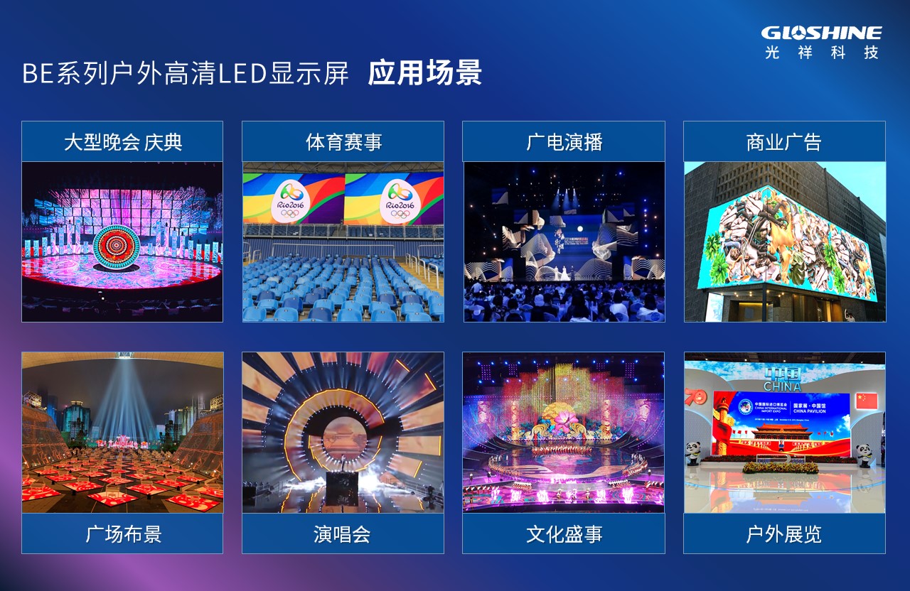 BE系列戶外屏簡(jiǎn)約的箱體設(shè)計(jì),絲毫不減其高穩(wěn)定性,并有著超廣視角,在戶外舞臺(tái)、廣電演播、廣場(chǎng)布景、大型晚會(huì)、體育賽事、戶外展覽等,有著極為廣泛的應(yīng)用。