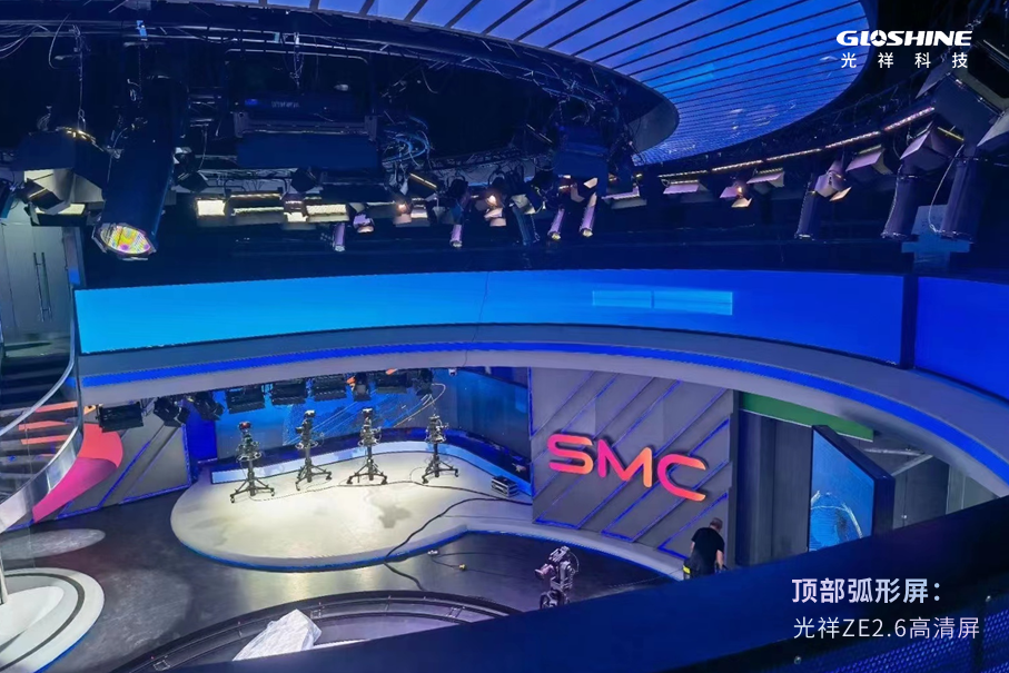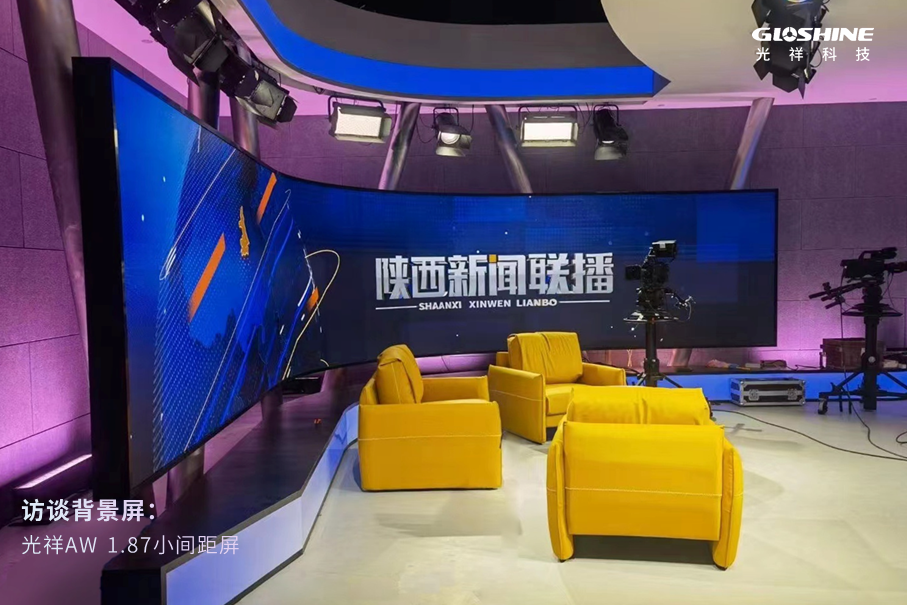 在陜西廣播電視臺新聞聯播直播間,主背景屏幕及訪談背景屏幕、站播屏均采用光祥AW系列小間距高清屏拼接而成,其平整順滑的弧形表面和細膩逼真的顯示效果,無懼近距離直播拍攝,完美呈現高清畫面。