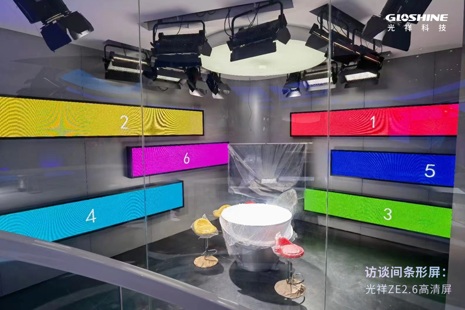 直播間頂部氛圍弧形屏及訪談間條形屏,由光祥ZE2.6高清LED顯示屏塑造。作為經典的移動高清LED顯示屏,光祥ZE系列有著超穩定的性能,長時間穩定輸出高清畫面,色彩鮮艷逼真、還原度高。