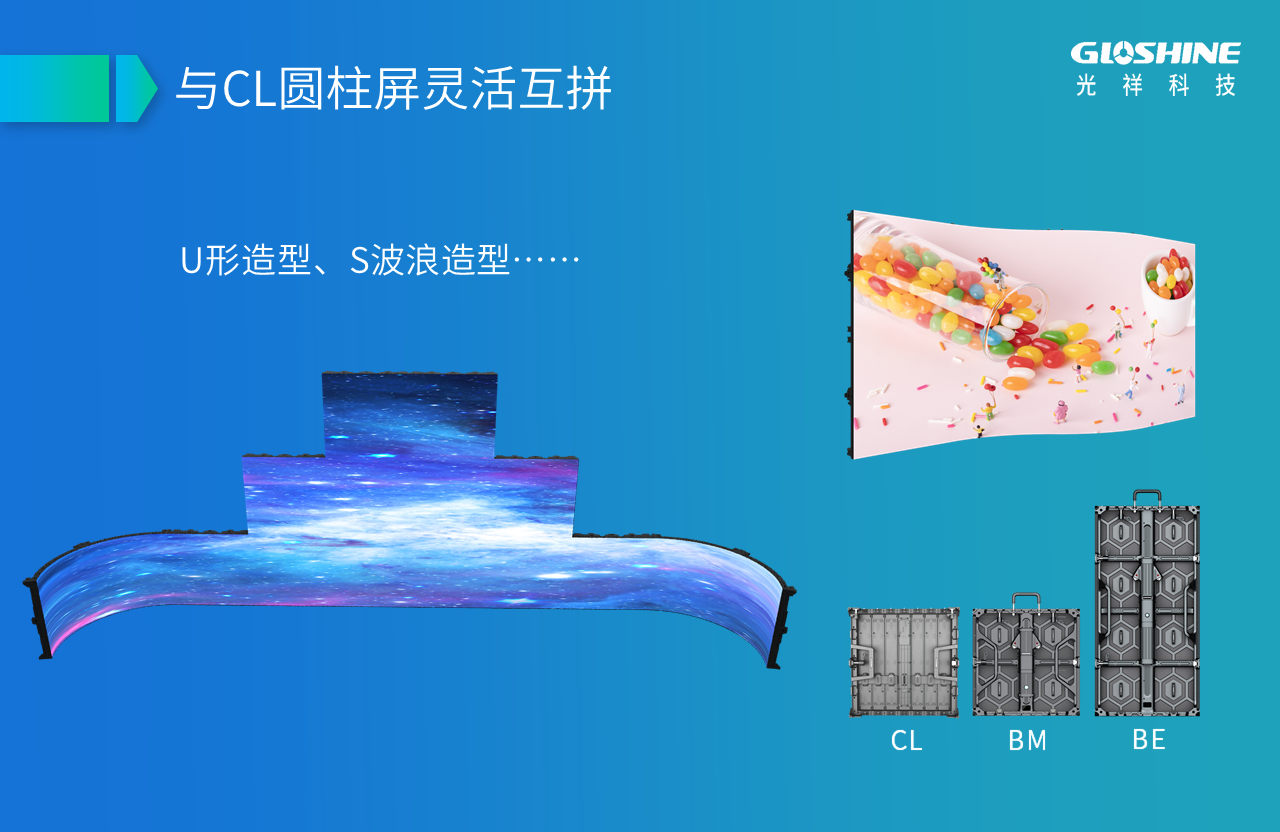 BE&BM系列戶內(nèi)戶外屏可分別與CL系列戶內(nèi)戶外圓柱屏互相拼接,塑造S波浪造型、U形造型等,創(chuàng)意無限。