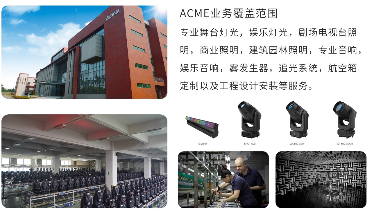 ACME成立于1985年,總部坐落于佛山市高明區(qū)"國(guó)家火炬計(jì)劃佛山新材料產(chǎn)品基地",擁有100余畝標(biāo)準(zhǔn)化現(xiàn)代廠房。公司集研發(fā),生產(chǎn),行銷于一體,歷經(jīng)30多年高速發(fā)展,ACME憑著卓越的產(chǎn)品和走在行業(yè)前沿的創(chuàng)新技術(shù),已經(jīng)成為全世界規(guī)模最大的娛樂和舞臺(tái)照明制造商之一。