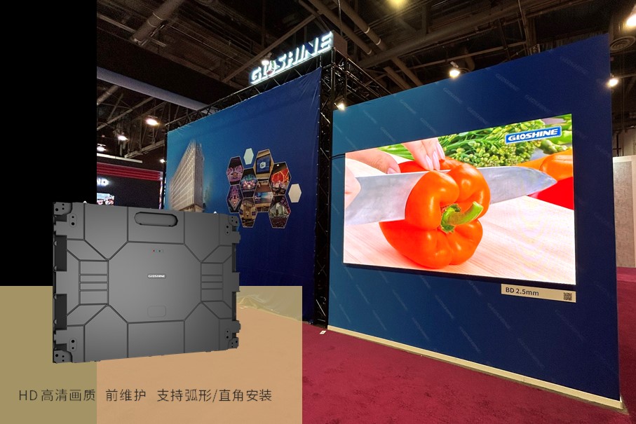 展位背面是BD系列小間距工程屏,超輕薄、低能耗、前維護(hù),防磕碰設(shè)計(jì),外部無線材設(shè)計(jì),廣泛應(yīng)用于直播間、會(huì)議室、宴會(huì)廳、商業(yè)廣告、安防指揮中心等。