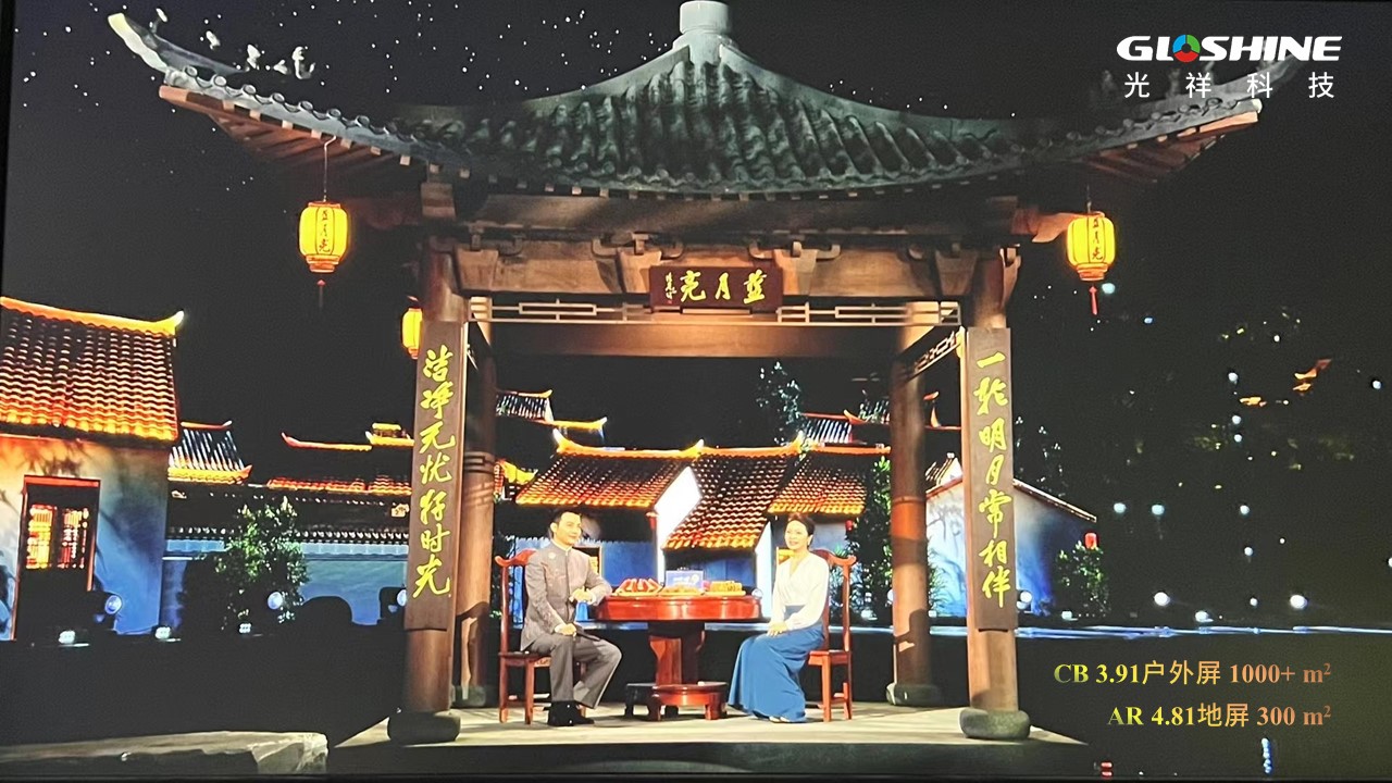 同時也作為虛擬屏幕,呈現尋常人家節日街景,與前景亭臺水榭融為一體。主持人在涼亭談話報幕,就如在家中小院閑話家常。