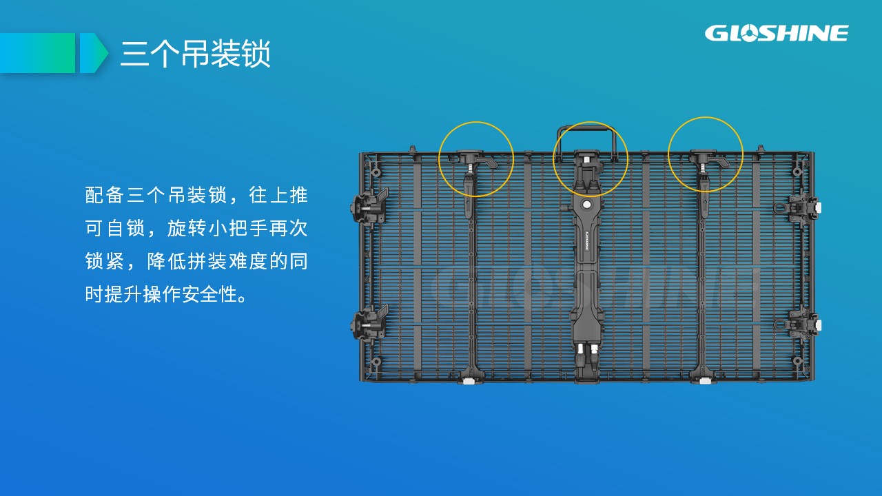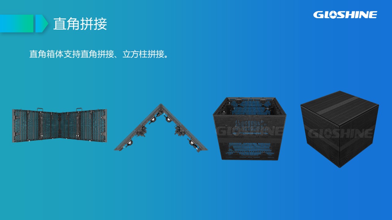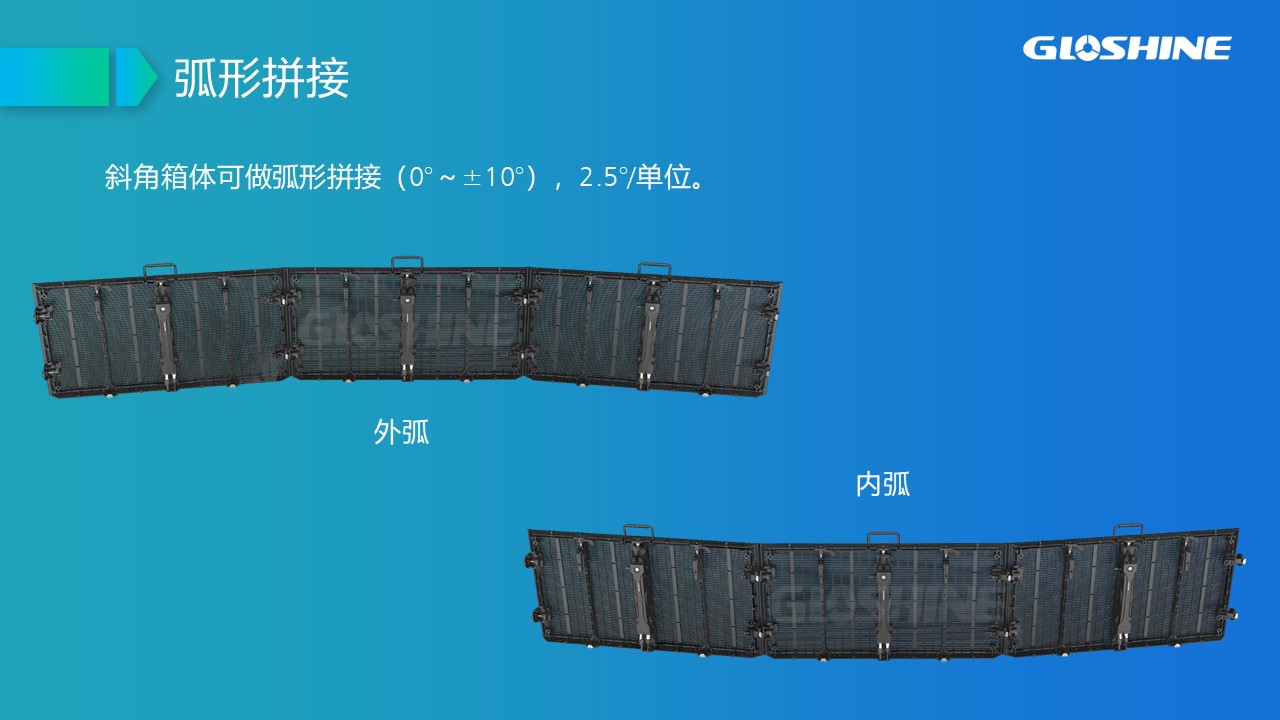 可拼弧度±10°;支持90°拼接;戶內租賃及固裝、吊裝;黑燈高亮;高通透率;超輕超??;抗風能力強,可抗8級以上大風;LED納米鍍層防護;面罩設計,解決PCB墨色不均勻問題;后蓋一體化設計。