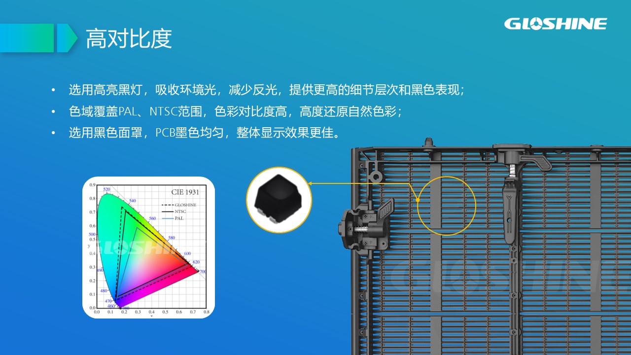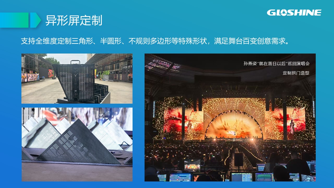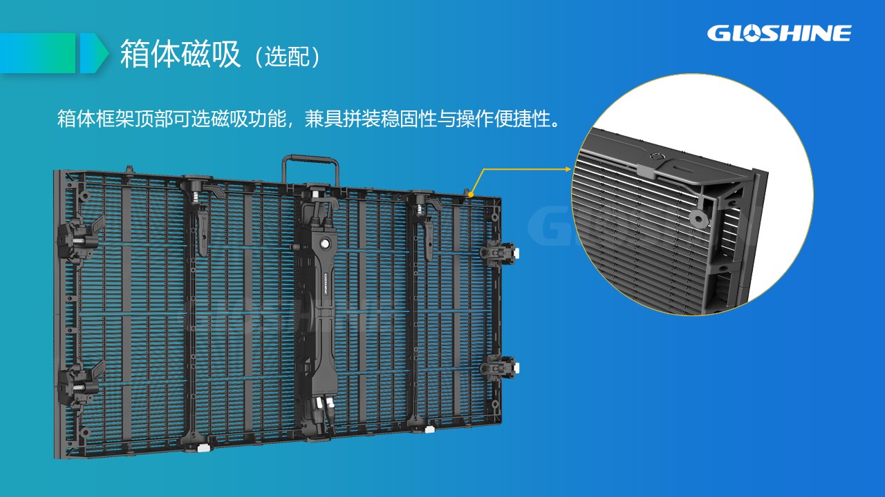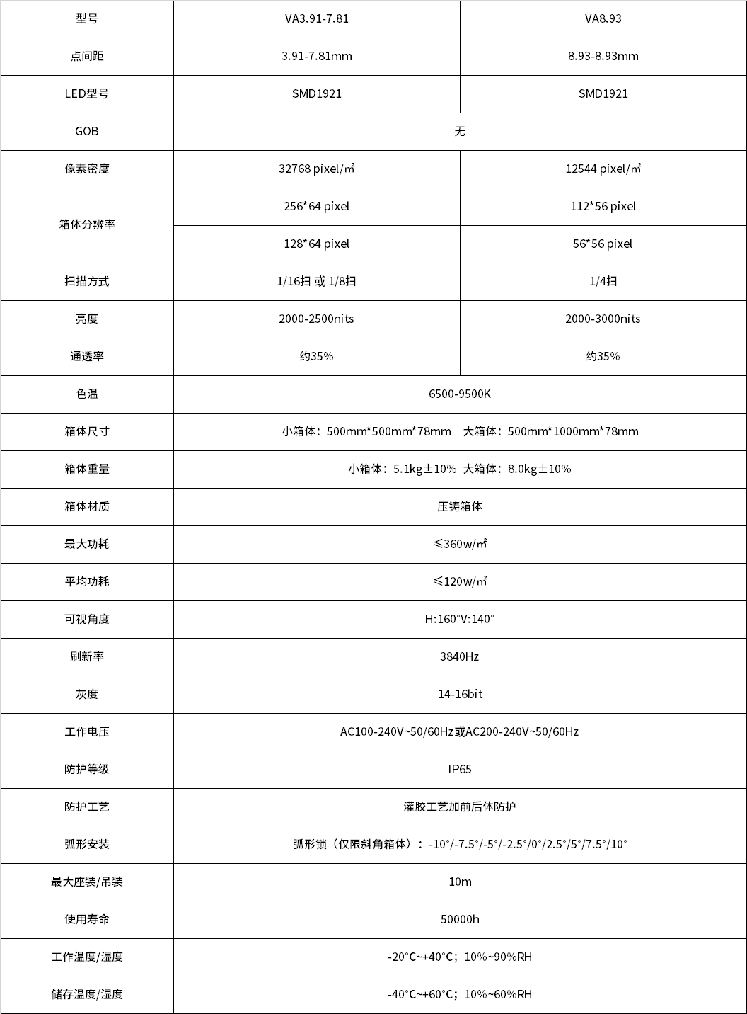 可拼弧度±10°;支持90°拼接;戶內租賃及固裝、吊裝;黑燈高亮;高通透率;超輕超??;抗風能力強,可抗8級以上大風;LED納米鍍層防護;面罩設計,解決PCB墨色不均勻問題;后蓋一體化設計。