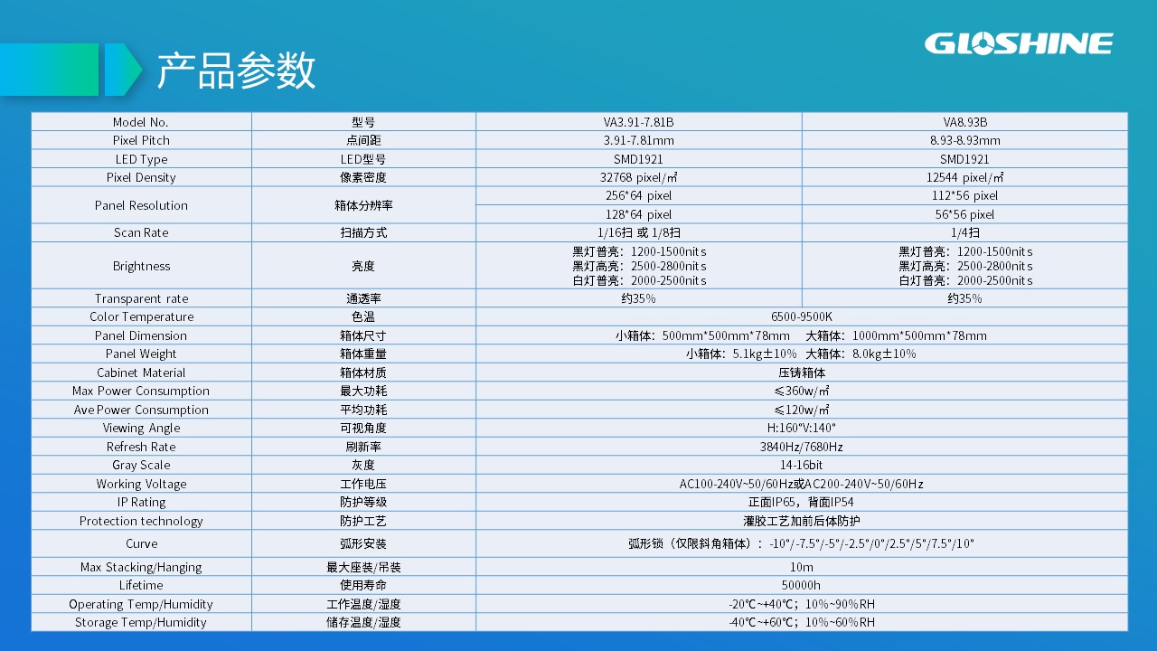 可拼弧度±10°;支持90°拼接;戶內租賃及固裝、吊裝;黑燈高亮;高通透率;超輕超薄;抗風能力強,可抗8級以上大風;LED納米鍍層防護;面罩設計,解決PCB墨色不均勻問題;后蓋一體化設計。