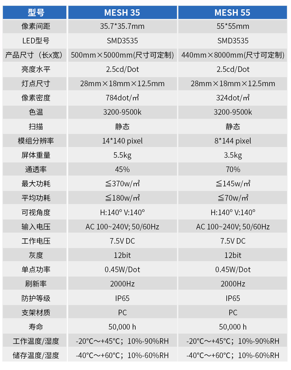 MESH系列材質輕、軟、透,屏體重量僅5.5kg;單燈智能芯片,燈點尺寸28*18*12.5mm,每個燈獨立工作;雙色注塑模,透光角度更大;引線式外觀結構,美觀、維修方便;兩邊按壓扣設計,連接屏方便快捷,可單燈固定在不規則圓柱上;1670萬種RGB合成真彩色,圖文色彩任意變化,可顯示圖像或視頻直播;支持像素間距35.7*35.7mm、55*55mm。
