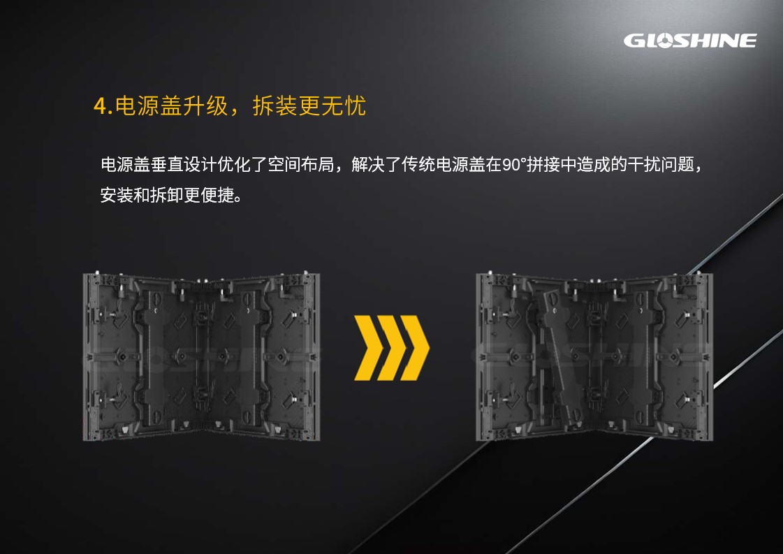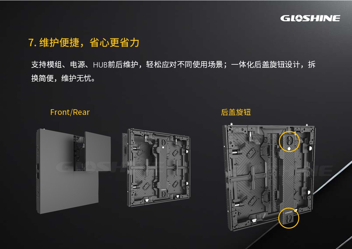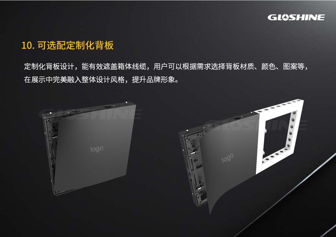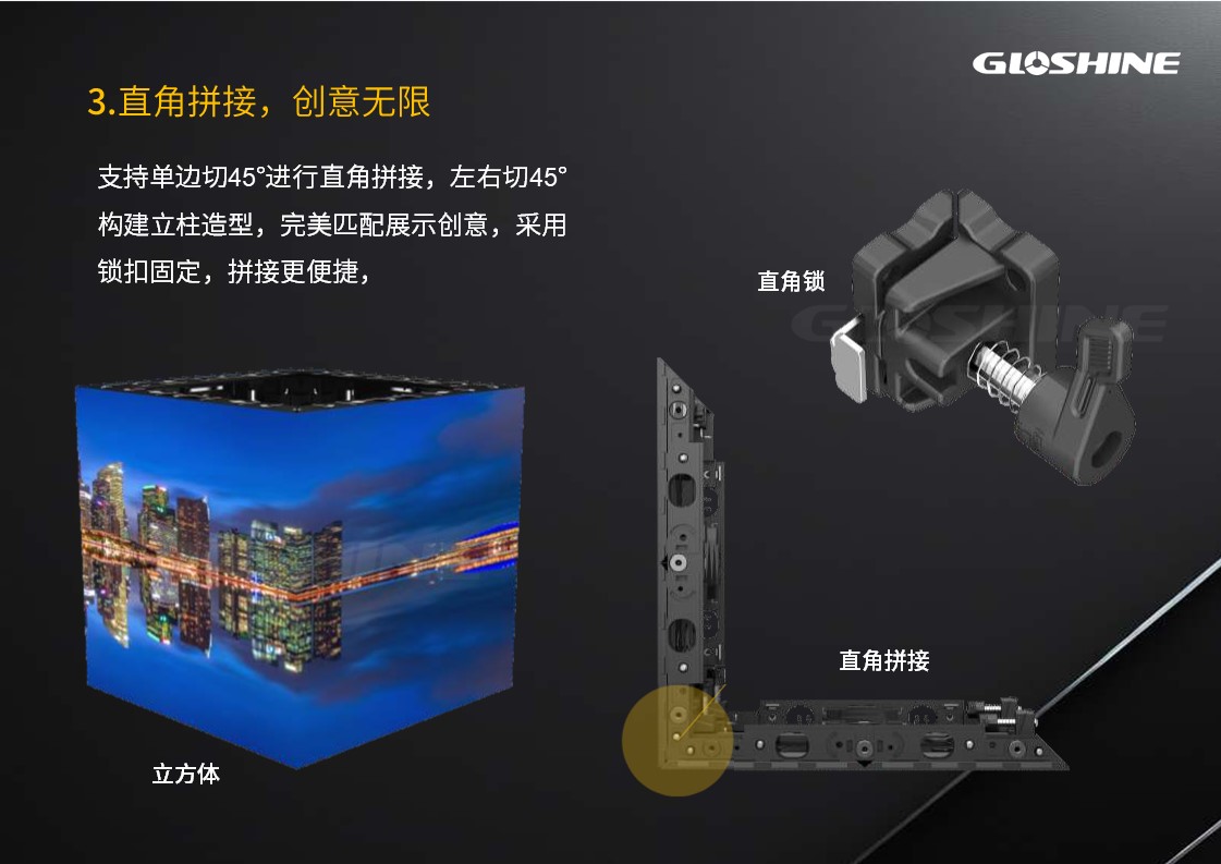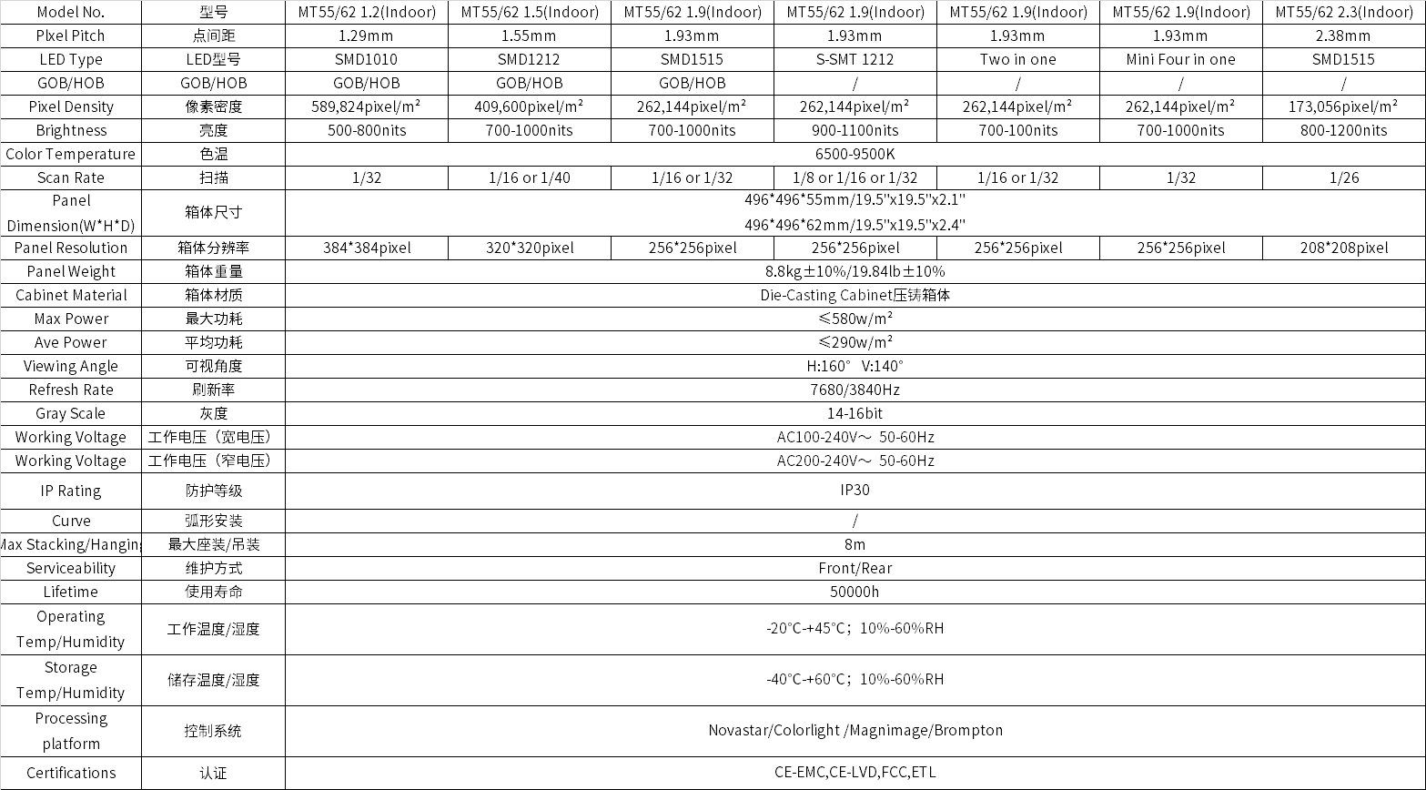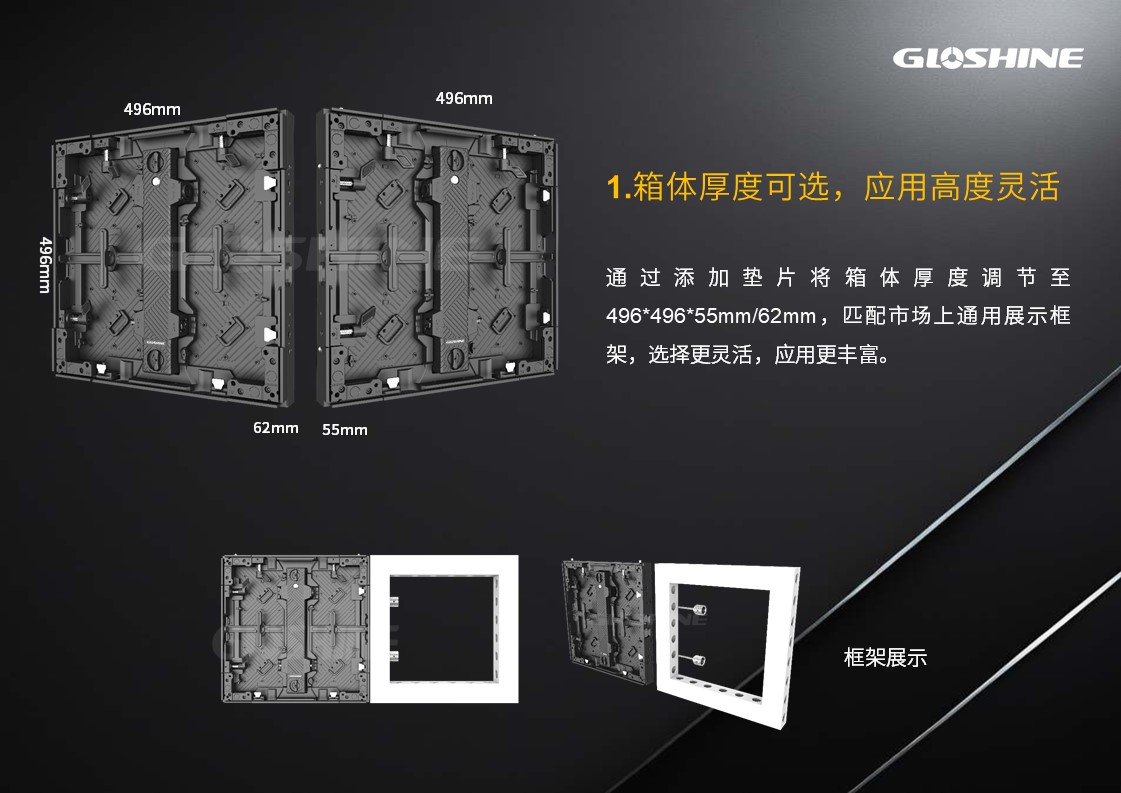 光祥MT系列LED顯示屏,擁有P1.2/1.5/1.9/2.3四種點間距,通過添加墊片調節箱體厚度,規格為496*496*55mm/62mm,完美兼容市場通用展示框架,支持單邊切45°進行直角拼接,可選GOB/HOG、S-SMT、MIP、SMD、二合一、四合一等多種工藝,可選定制化背板,滿足不同場景下的定制化需求,為租賃展示、品牌活動等場景提供穩定、高效、高品質的視覺解決方案。
